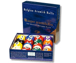 Das Super Aramith Pro Billardkugel-Set verfügt über folgende Eigenschaften : 1 Profi-Satz in höchster Qualität Präzise Kalibrierung jedes Balls für maximale Konsistenz innerhalb des Sets. 2 Weltweit führend Aramith Phenolharz in Profiqualität, werden weltweit bei Turnieren eingesetzt. 3 Inklusive des Aramith Spielballs Red Dot Für ultimativ präzise Stösse und Ballkontrole. 4 Aussergewühnlich lange Nutzungsdauer Durchgehärtete keramische Oberfläche mit ultrahoher Dichte für aussergewöhnliche Kratz- und Stossfestigkeit. 5 Schont Ihr Tuch Extra haltbare, glatte Oberfläche, die den Verschleiss des Tuchs minimiert und eine längere Nutzungsdauer von Tuch und Ball garantiert. 6 Hergestellt aus Super Aramith Pro Das hochwertigste verfügbare Phenolharz, das in den Laboren von Saluc entwickelt wurde. 7 Erfüllte alle Anforderung für professionelles Billardspiel Für alle Kriterien: Dichte, Balance, Durchmesser, Rundheit, Farbe, Glanz, Härte, Gewicht.