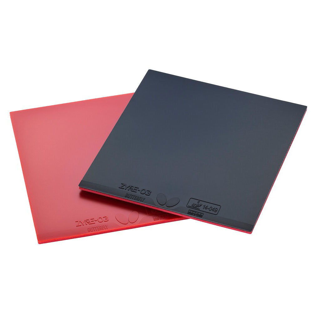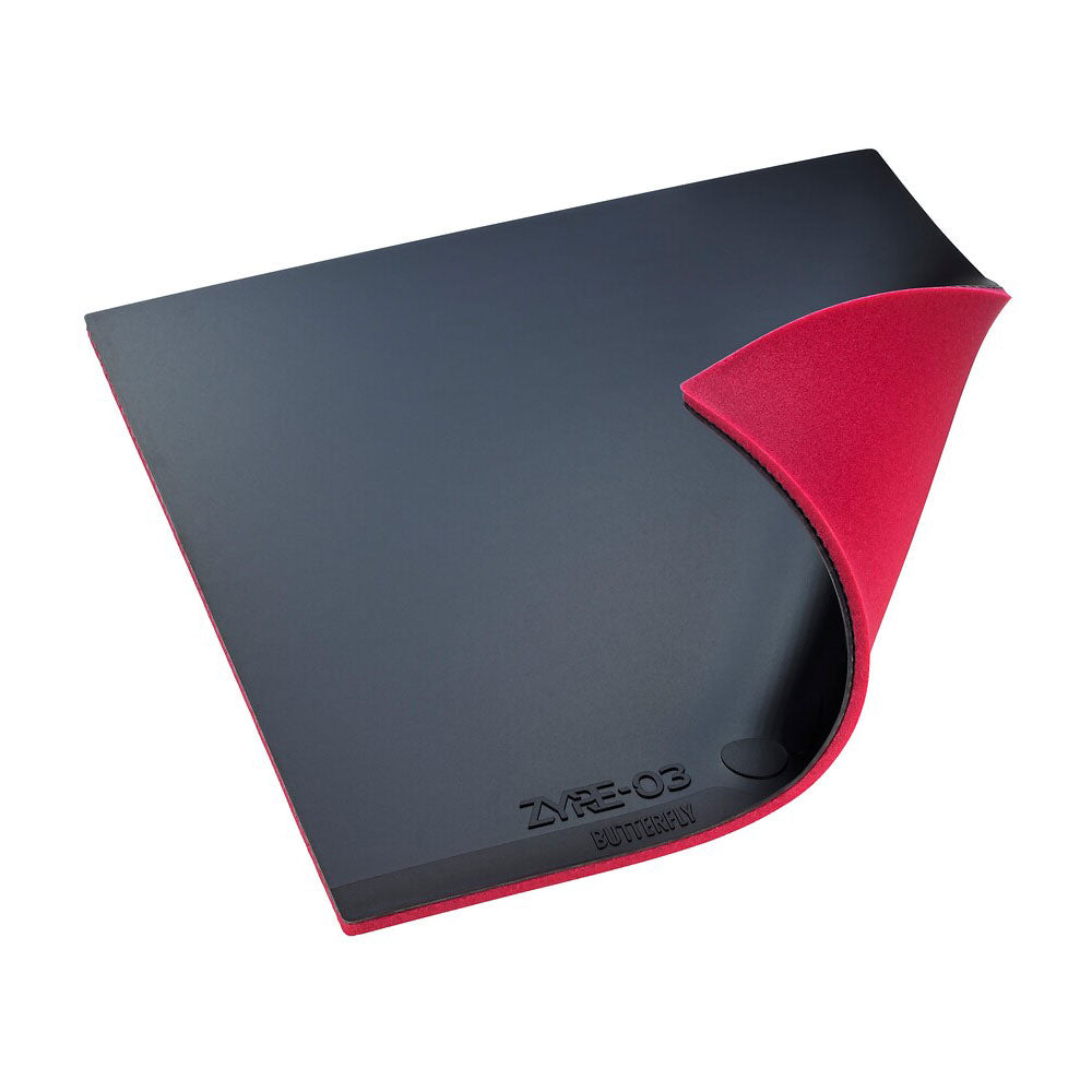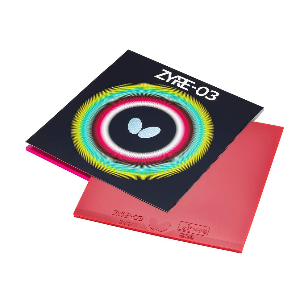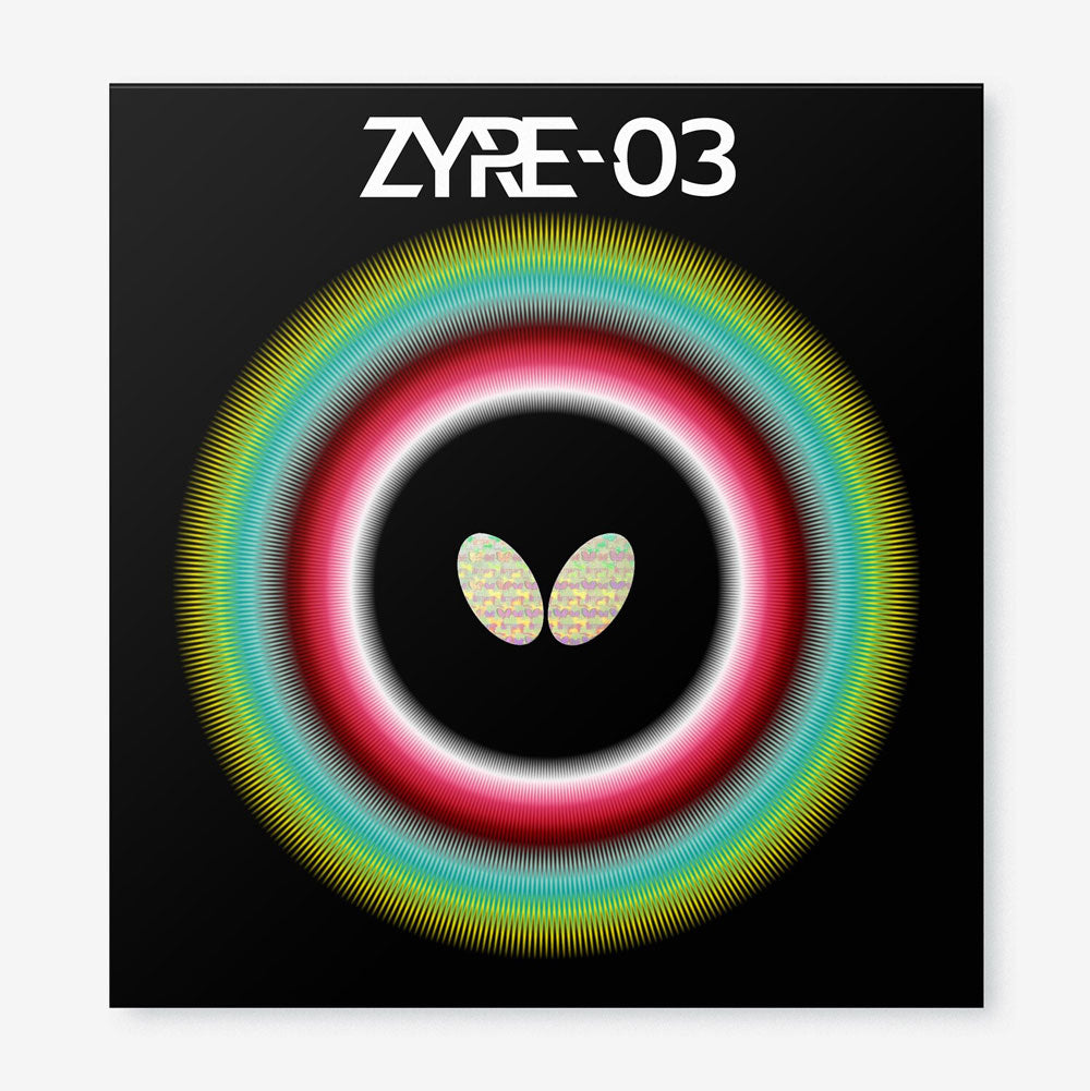 Der Zyre-Belag besteht aus dem neuartigen „Ricosheet“, einer Oberschicht mit eng gestaffelten, flachen Noppen, und einem extrem dicken Schwamm mit Spring Sponge X Technologie. Zusätzlich zu dieser besonderen Struktur verfügt der Belag über eine Oberfläche mit erhöhter Abriebfestigkeit und ein ausgezeichnetes Ballgefühl. Durch die Verwendung des Noppen-Codes Nr. 303, der mit Spin auch Kraft entfaltet, ermöglicht Zyre 03 Schläge, die mit starkem Bogen tief in der gegnerischen Spielfeldhälfte auftreffen. Dieser Belag wird für Spieler empfohlen, die mit kraftvollen, spinreichen Schlägen das Spiel dominieren möchten.
