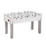 Der G-500 Pure White verbindet das elegante Ahorndesign mit einer soliden Konstruktion in Gesamtweiss. Korpus aus MDF mit Laminatbeschichtung, Stärke 25mm. Farbe: Weiss mit silbernen Ränder. Viereckige Metallfüsse (cm. 9 x 9) mit kratzfester Silber Lackierung. Höhenverstellbare Wettbewerb-Füsse für das Justieren einer vollkommen waagerechten Ebene des Spielfeldes. Besonders belastbare Stangen aus verchromtem und rostfreiem Stahl, Durchmesser 16mm. Auf Wunsch mit Sicherheits-Teleskopstangen erhältlich. Kugellager aus Stahl garantieren eine hohe Leichtgängigkeit der Stangen, hohe Spielgeschwindigkeit und Spielkomfort mit geringen Handgelenksbelastungen für die Spieler. Spieler, weiss und grau, aus Kunststoff sind direkt auf die Stangen gegossen. Spielfeld, aus sandgestrahltem Glas, weiss mit grau Spiellinien. In Kunststoffgriffe eingelegtes wenge Holz vermeidet Handschweiss und verbessert die Griffigkeit. Einfache Entnahme der Bälle hinter den Toren. Masse Fussballtisch: Standardstangen 143x125x88 cm Der Fußballtisch wird mit 10 orange Standardbällen geliefert.
